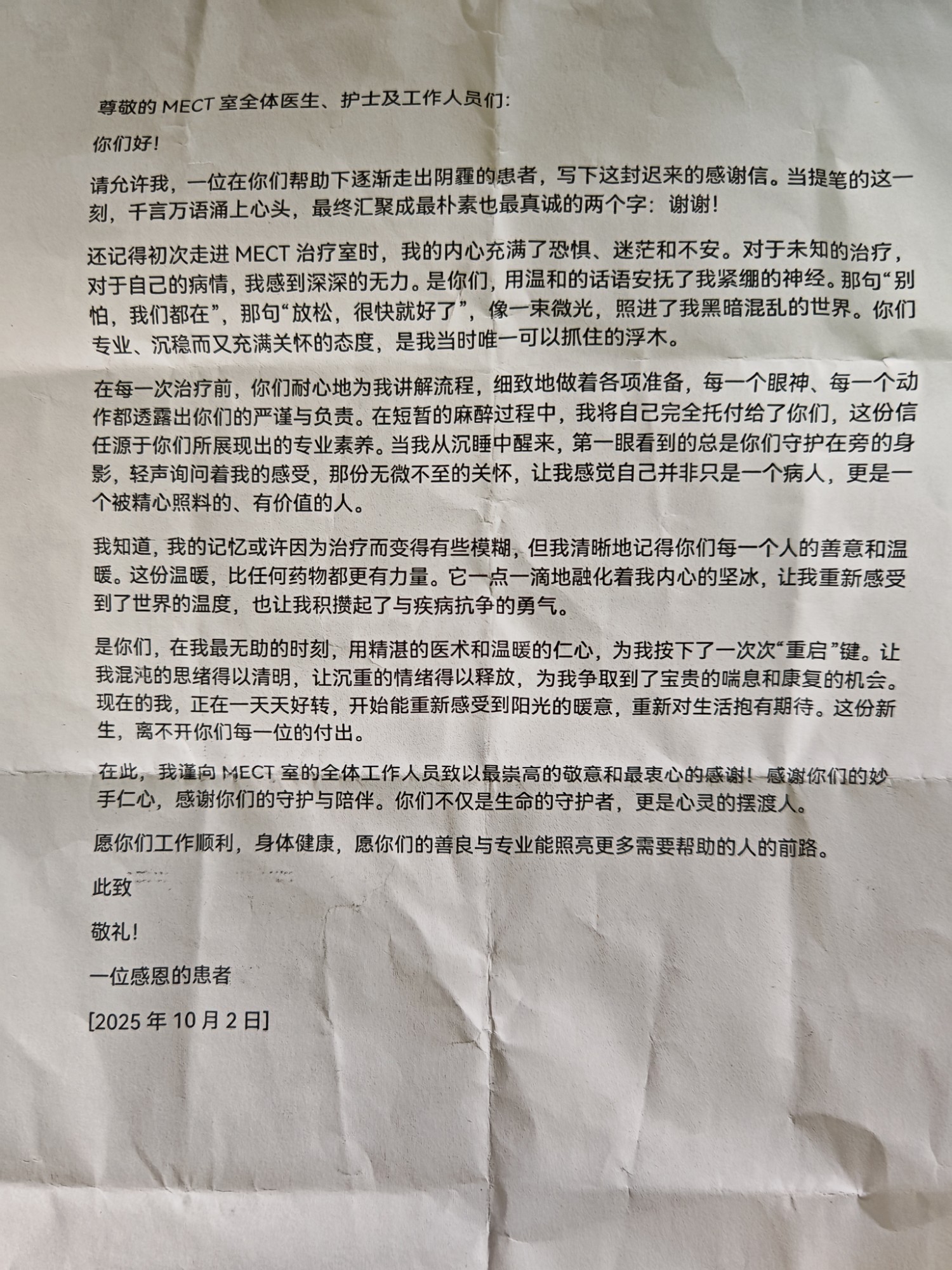 这封感谢信的价值,不仅在于温暖了医护人员的心,更在于它从一个亲历者的角度,真实展示了科学、人文关怀与患者勇气相结合后所产生的巨大治愈力量。它让更多人认识到,MECT治疗并非如传闻中那般可怕,而是在专业医护人员的操作下,为患者带来新生的希望之光。