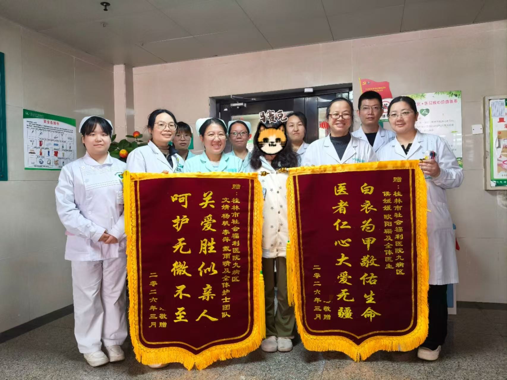 两面锦旗上,“白衣为甲 救佑生命 医者仁心 大爱无疆”与“呵护无微不至 关爱胜似亲人”金色大字熠熠生辉。这不仅是患儿全家的厚重感激,更是对儿少精神科全体医护人员精湛医术与温情守护的最高褒奖。